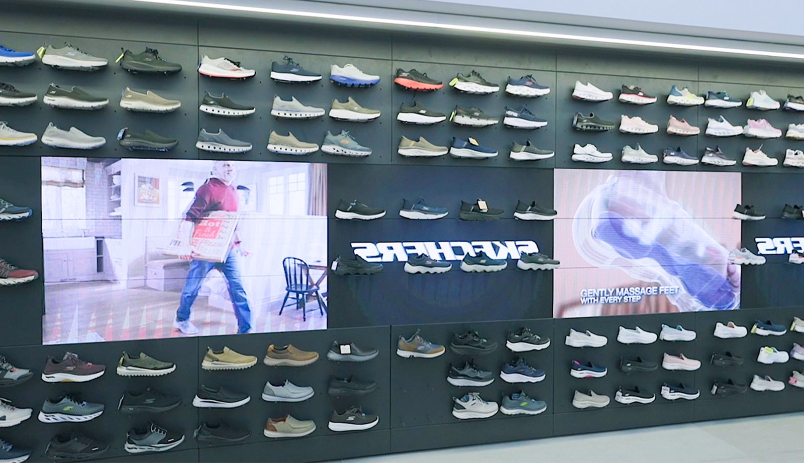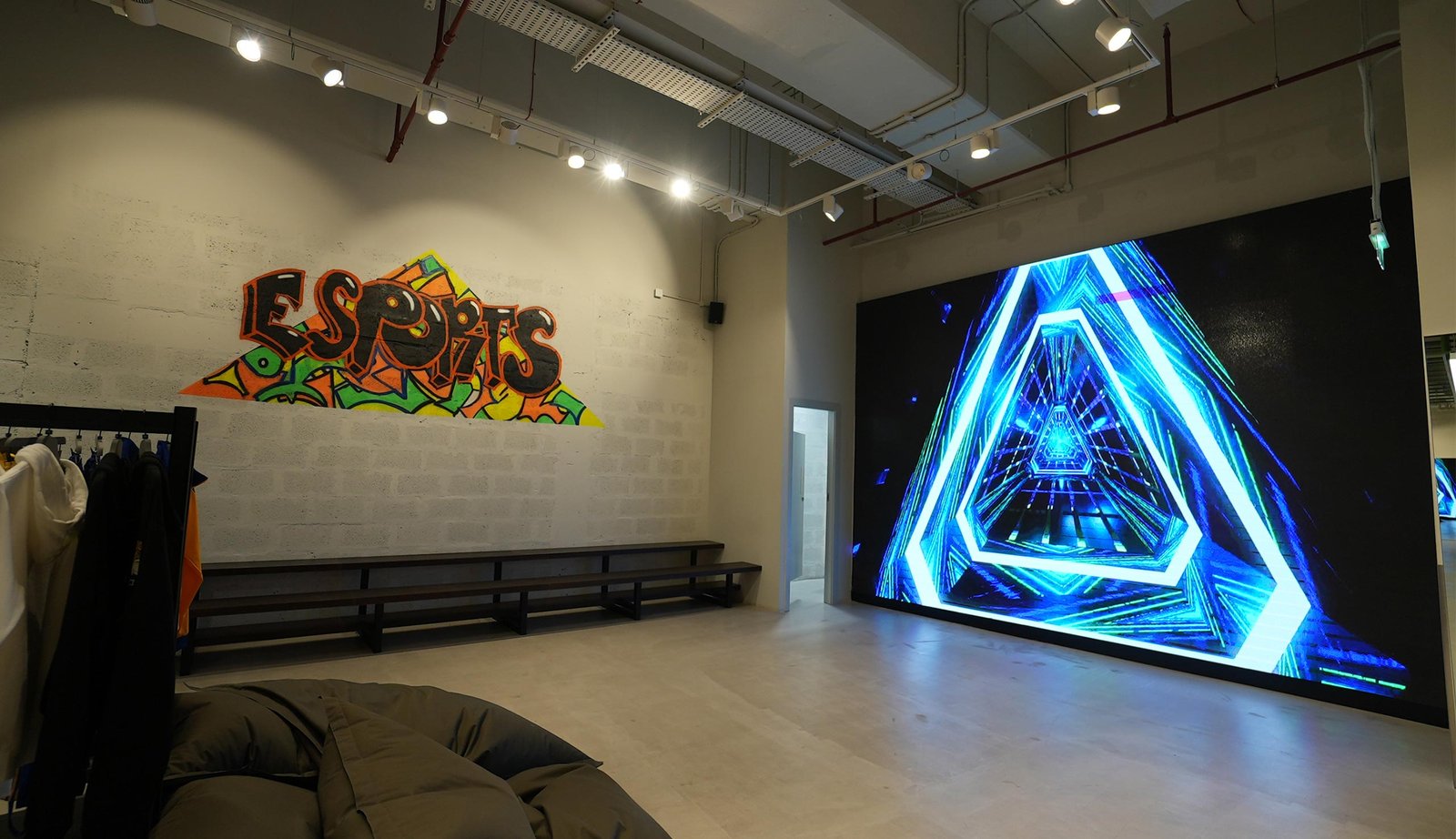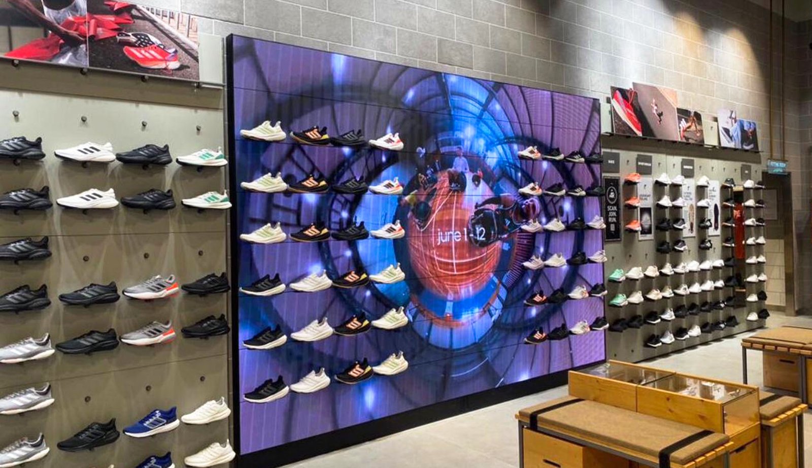 Integrated LED screens are seamlessly embedded into the setup, adding dynamic, visually engaging elements. The blend of traditional display techniques with digital innovation creates an eye-catching and contemporary retail presentation.